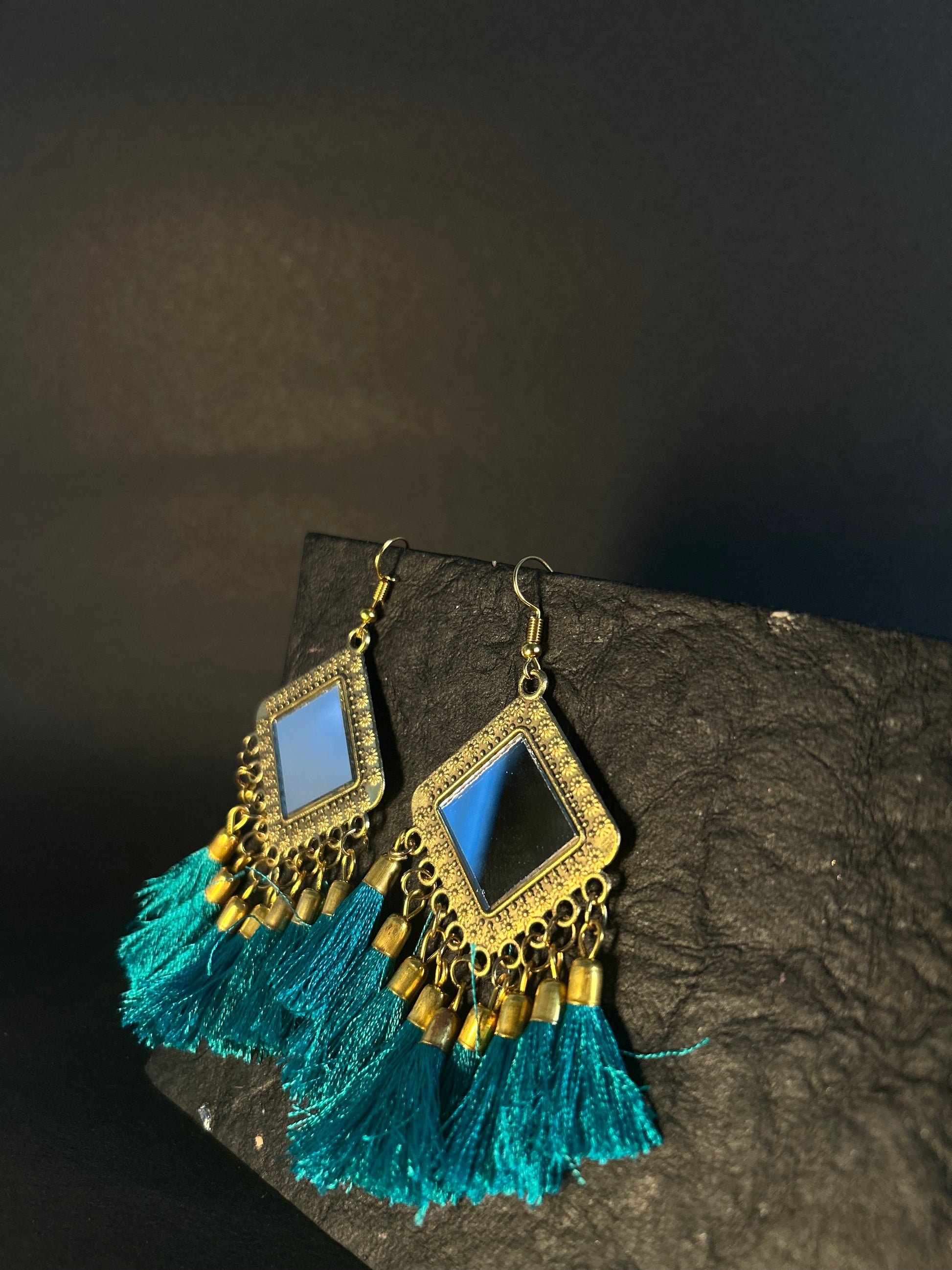 These stunning gold-colored earrings feature vibrant green tassels and a captivating mirror centerpiece that reflects light beautifully. The elegant design combines the warmth of gold with the playful charm of the green tassels, creating a striking contrast. Lightweight and comfortable, these drop earrings sway gracefully with every movement, making them perfect for both casual outings and festive occasions.