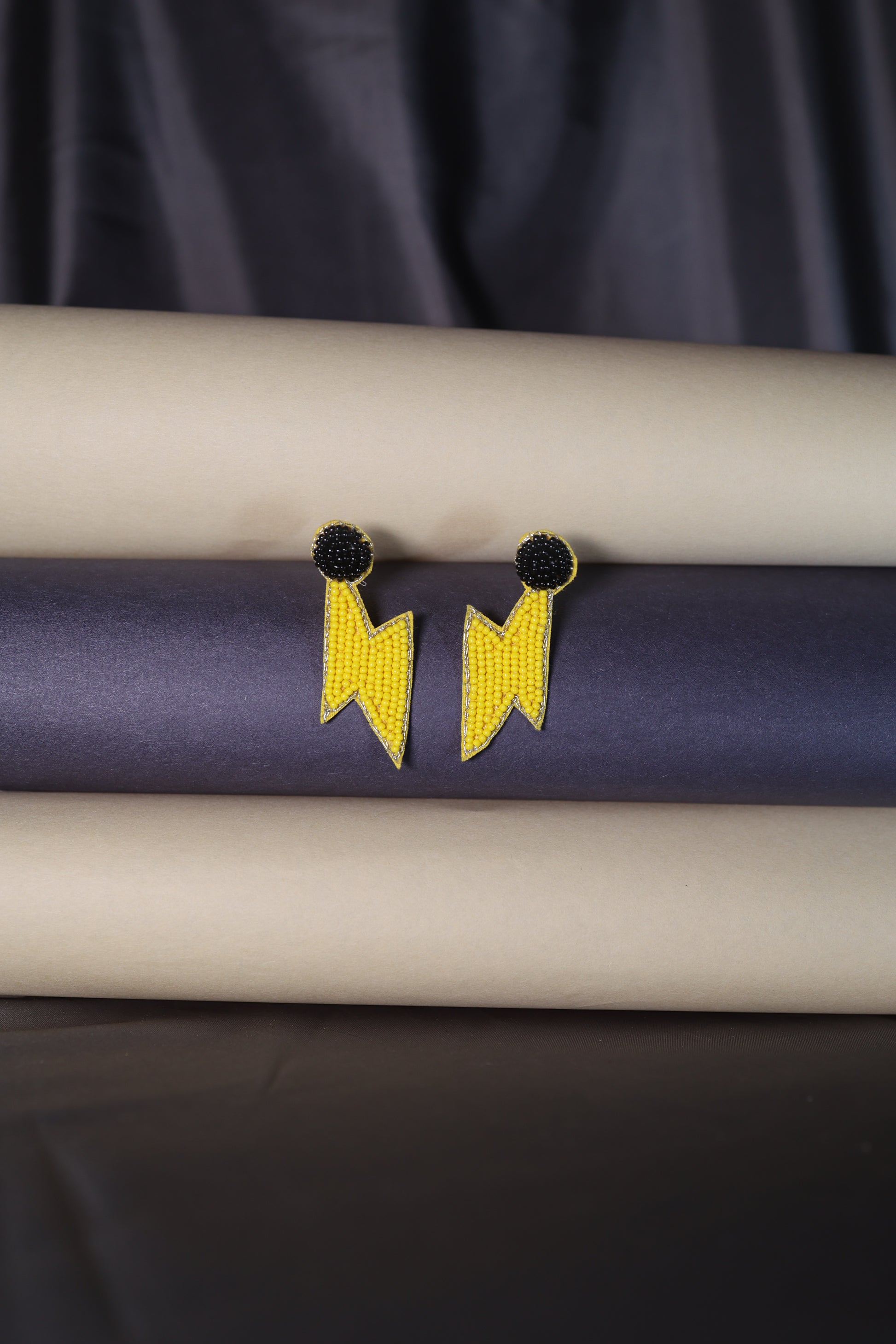 These striking handmade beaded earrings feature a bold thunderbolt shape, designed with precision and creativity. Crafted from high-quality glass beads, the earrings are carefully arranged to form a dynamic, angular lightning bolt design. With a striking combination of metallic and matte beads in hues of gold, yellow and black, these earrings capture the energy and power of a thunderstorm. The beading technique creates a textured, dimensional effect that adds depth and movement to the design. Lightweight yet dramatic, these earrings are the perfect statement piece to add an electrifying touch to any outfit.