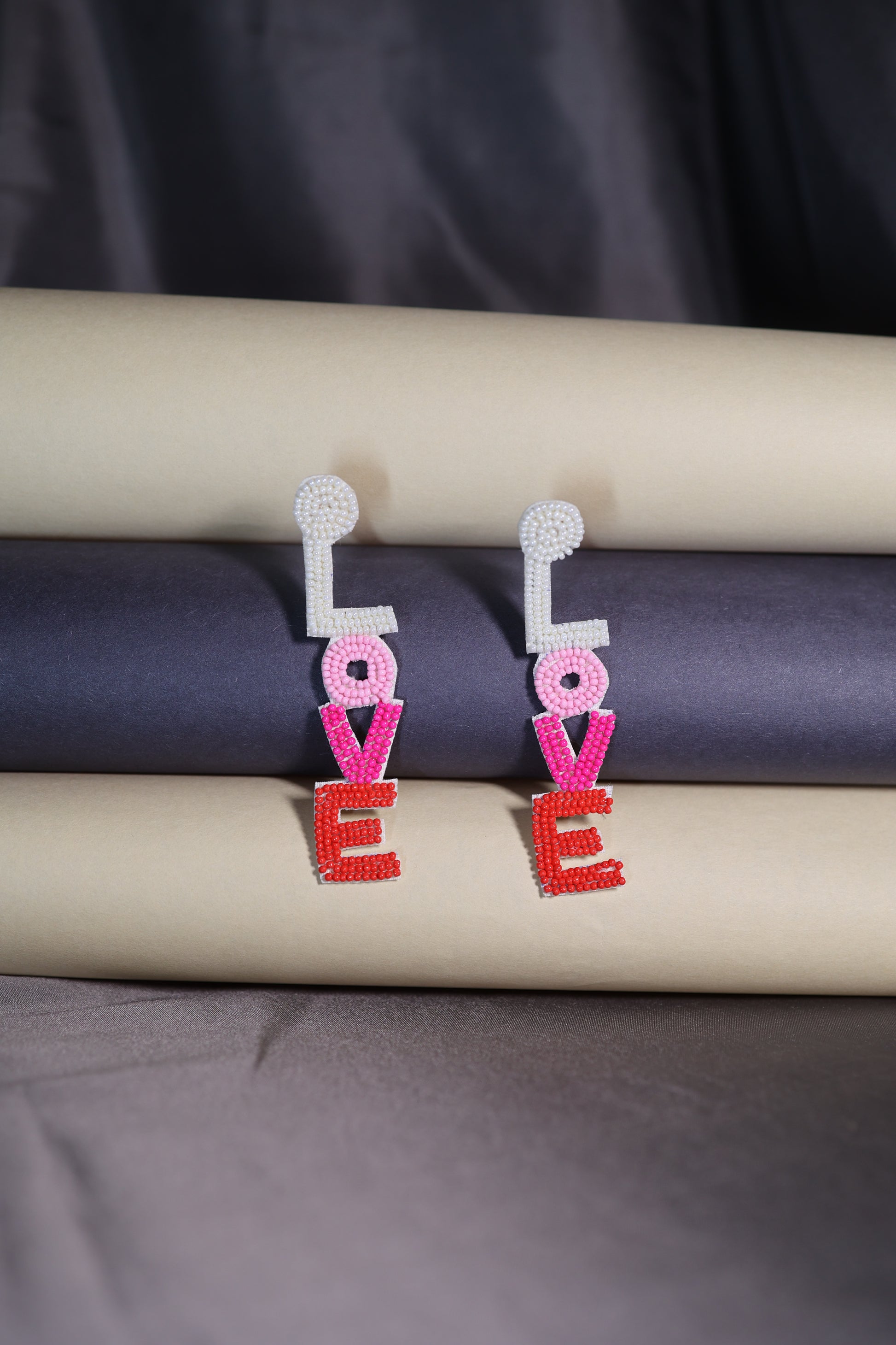 These handmade beaded earrings are a unique and playful expression of affection, crafted in the shape of the word "LOVE." Each earring is carefully designed using high-quality, vibrant beads, arranged in a detailed pattern to spell out the word in a bold, eye-catching style. The beads, which can range from tiny seed beads to larger, more colorful gems, create a textured design that catches the light and adds a lively, joyful touch to any outfit.