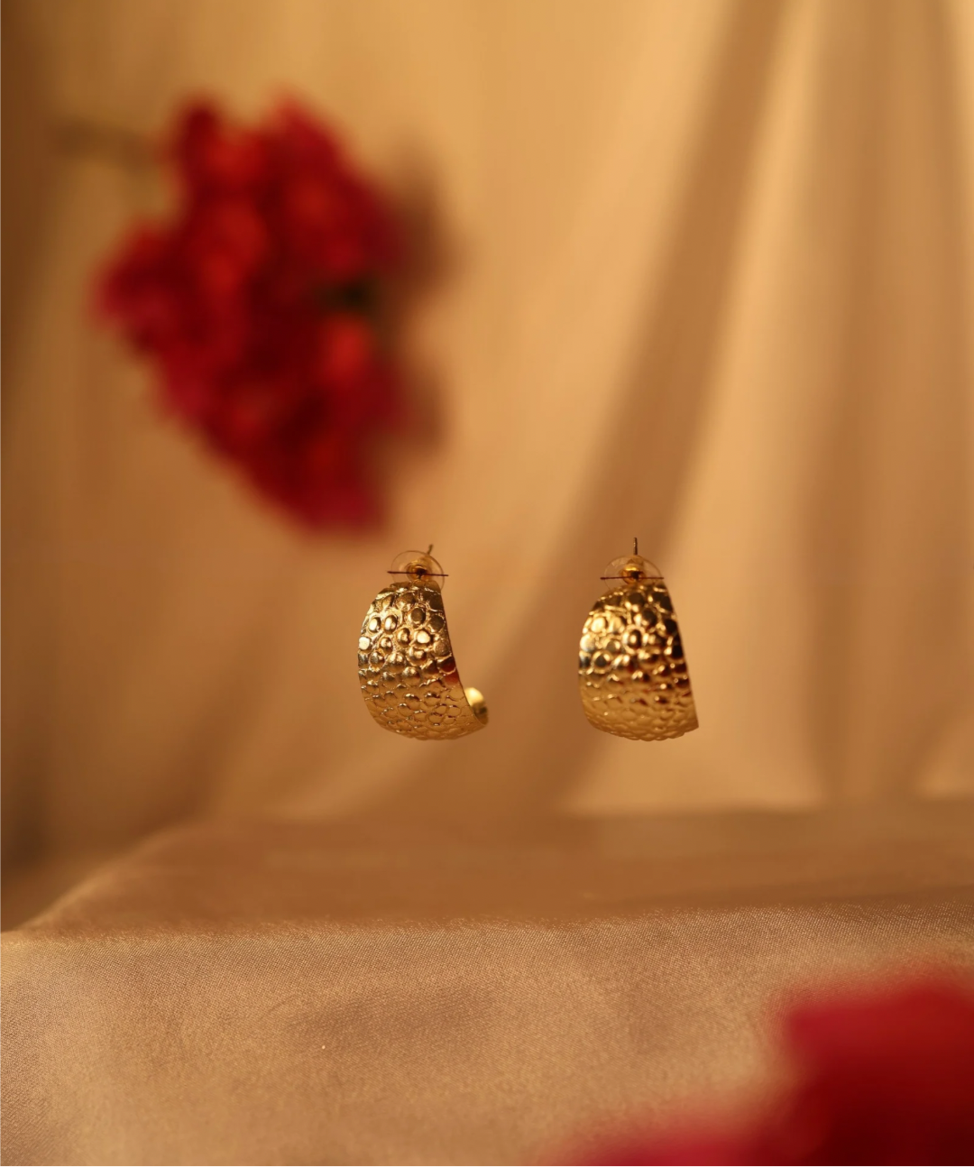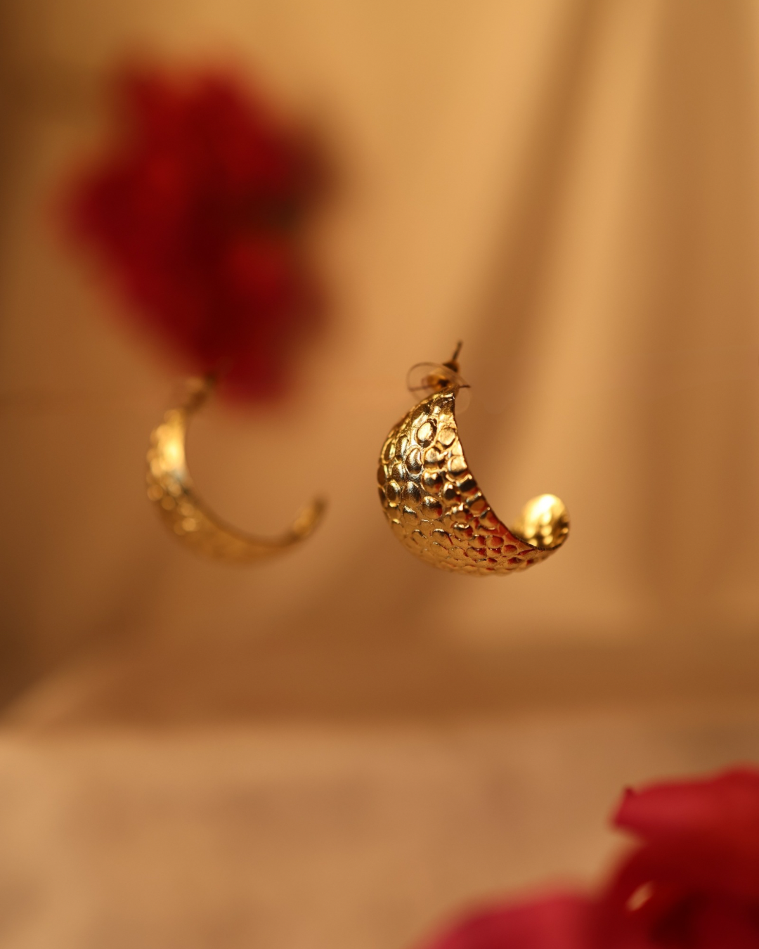 These earrings feature a sideways half-moon shape, crafted in bronze and gold, with a snake skin-like texture running along the top for a bold, unique touch.