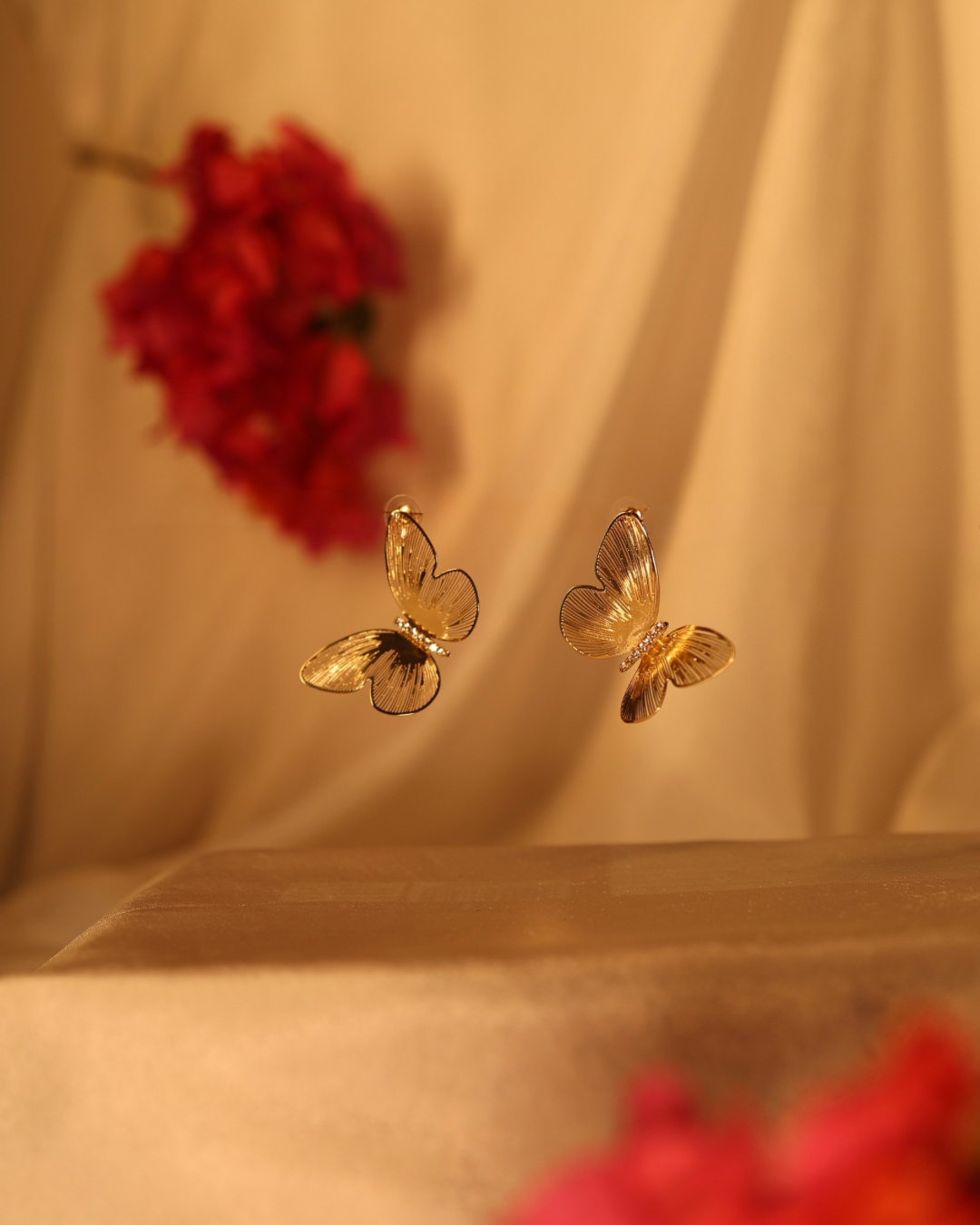 These delicate earrings feature a beautifully crafted butterfly in mid-flight, designed to appear as if it's gently soaring sideways. The transparent wings give the earrings an ethereal, light feel, adding an elegant touch of nature-inspired beauty. Perfect for adding a graceful, airy element to any look.