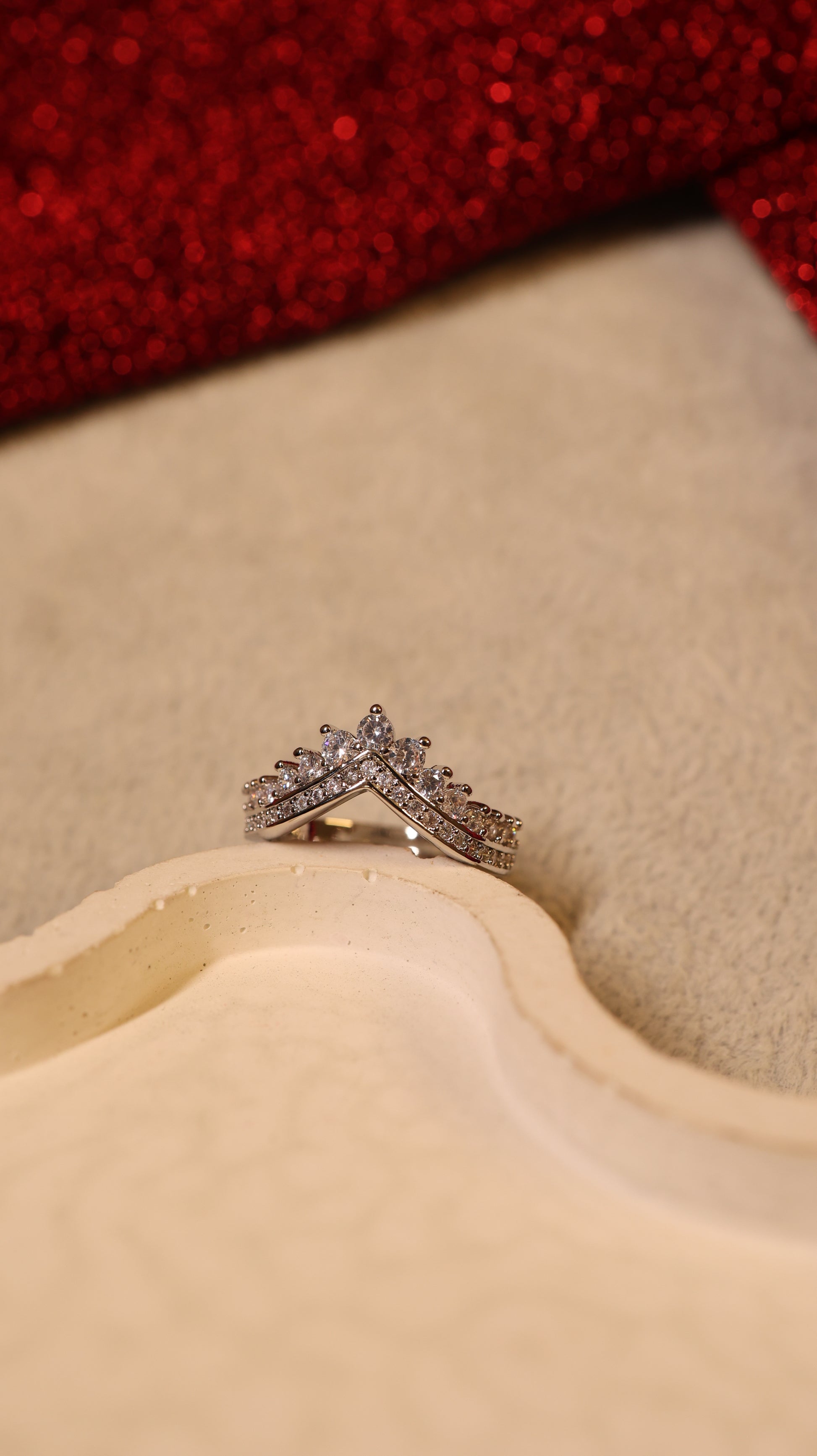 This elegant adjustable ring features a unique double layered design, each layer encrusted with sparkling stones that form a graceful crown like silhouette. The intricate structure gives refined appearance, perfect for adding a touch of royalty to any outfit. Its open, adjustable ensures a comfortable fit for any finger, combining with style.