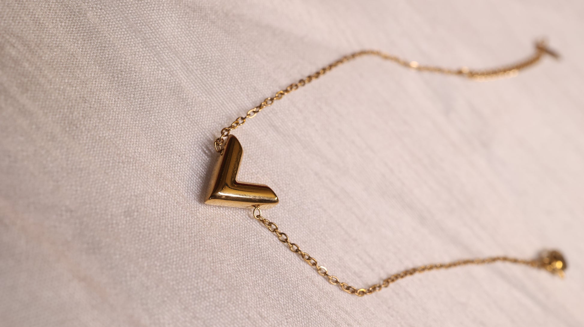 A striking blend of elegance and edge, this bracelet features a heart-shaped design with sharp, tapered ends, symbolising both passion and strength. Crafted in radiant gold, it wraps the wrist in a bold yet romantic silhouette. The sleek finish and unique contour make it a standout accessory perfect for those who wear their heart with a hint of attitude.