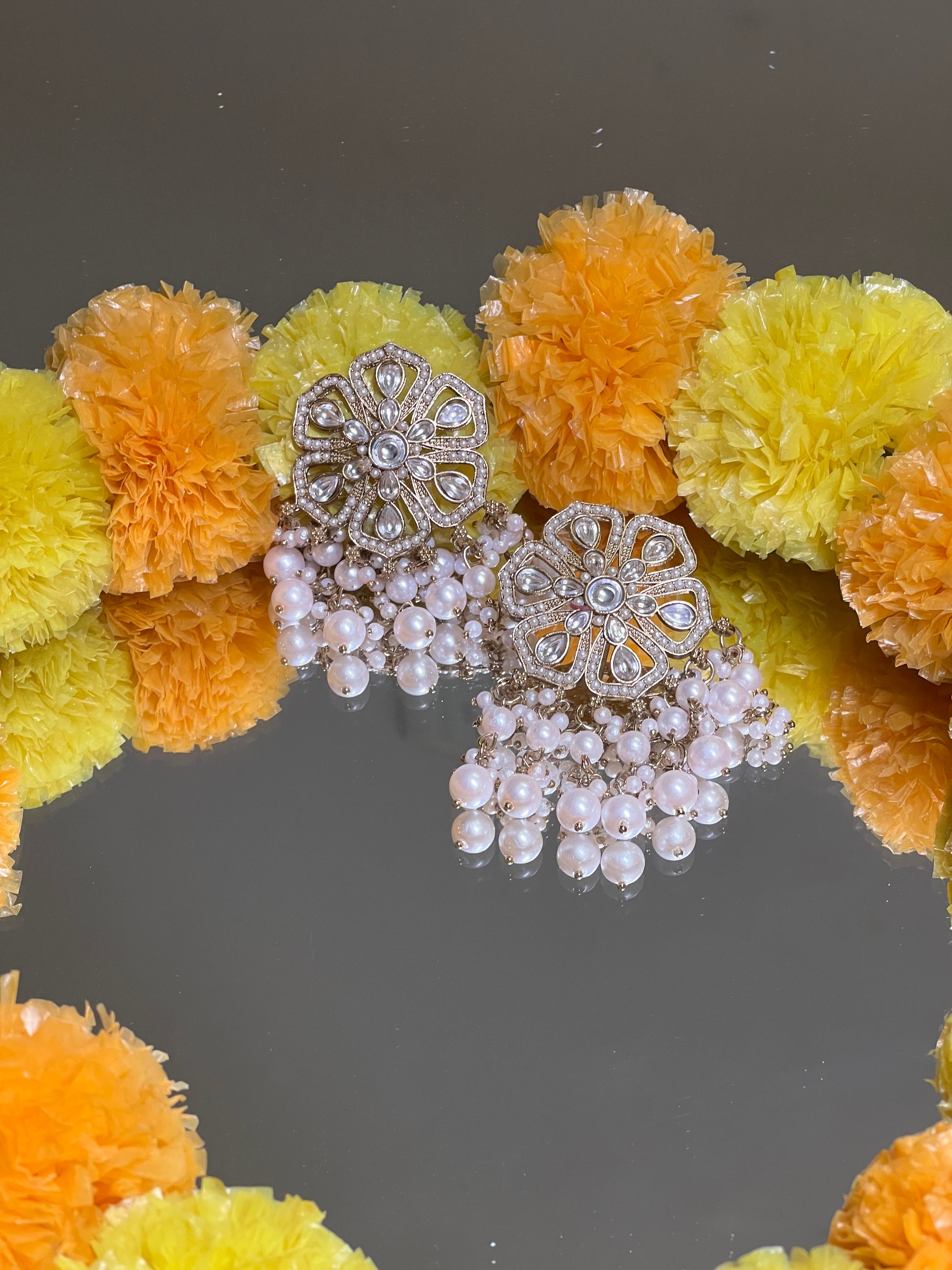 These festive earrings are the epitome of traditional luxury with a modern flair, designed to add a touch of opulence to any festive ensemble. The earrings are crafted with intricate Kundan work a traditional technique where gemstones are set in gold or gold plated settings, often surrounded by delicate borders of intricate metalwork.