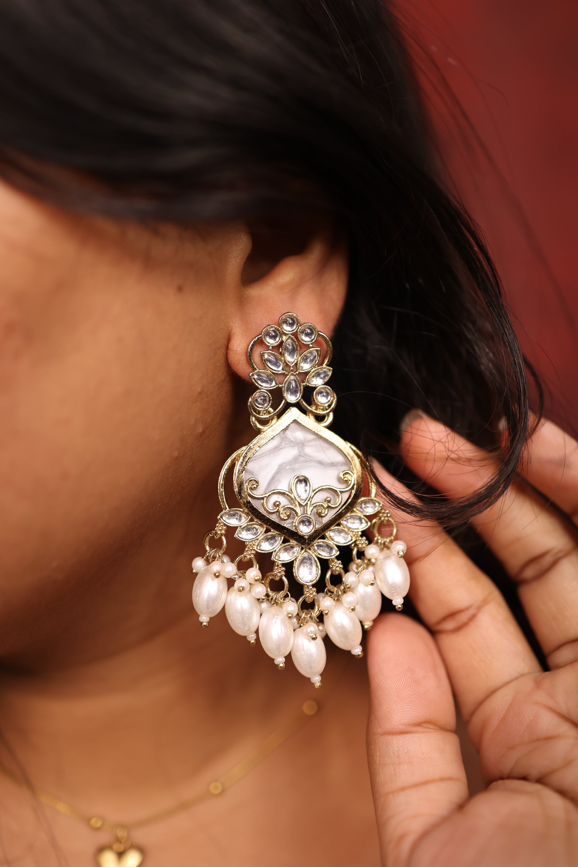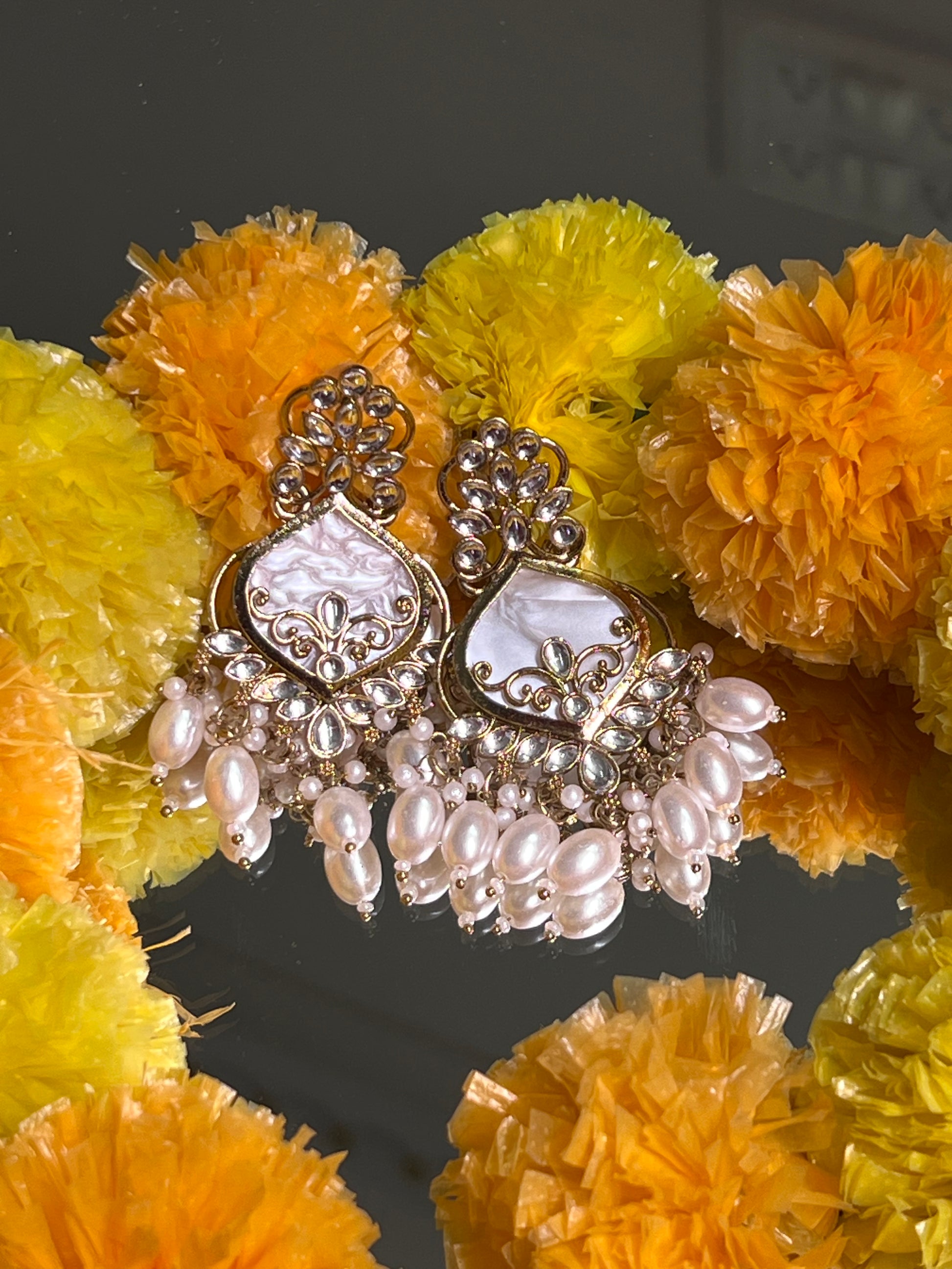These festive earrings are the epitome of traditional luxury with a modern flair, designed to add a touch of opulence to any festive ensemble. The earrings are crafted with intricate Kundan work a traditional technique where gemstones are set in gold or gold plated settings, often surrounded by delicate borders of intricate metalwork.