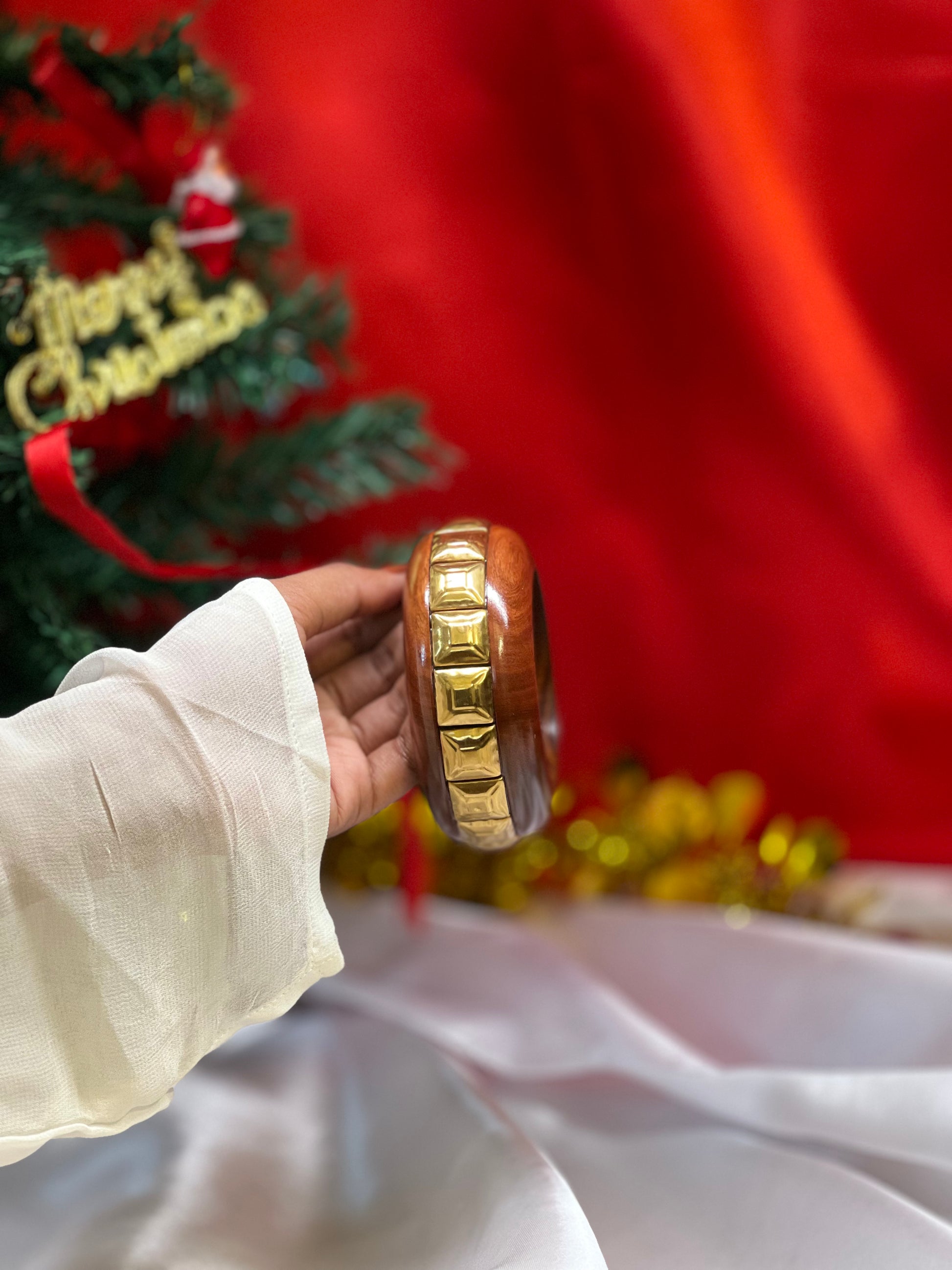 Crafted with artisanal detail, this wooden bangle features a continuous row of square shapes running seamlessly around the center. The rich, natural wood grain adds warmth and character, while the repeating square pattern brings a modern geometric touch. Lightweight, stylish, and effortlessly versatile, this bangle is perfect for adding a hint of contemporary elegance to everyday outfits or pairing with other accessories for a bold, layered look.