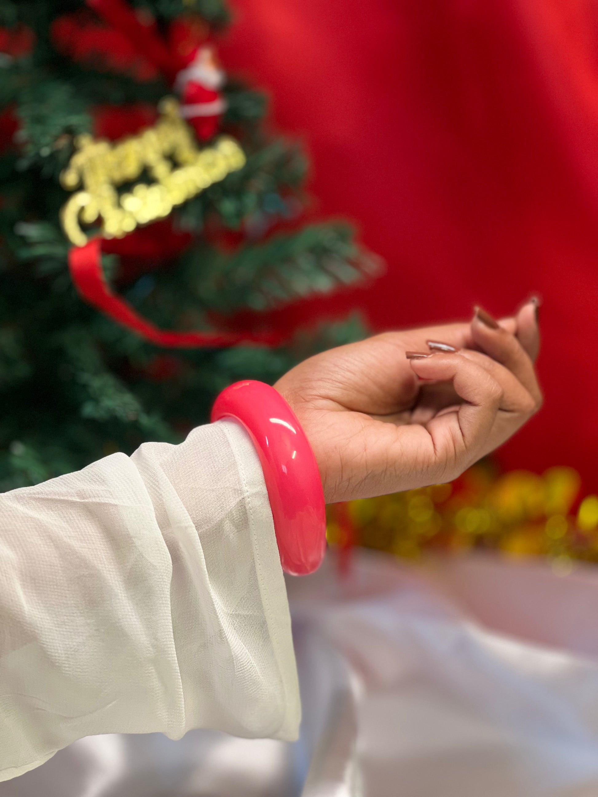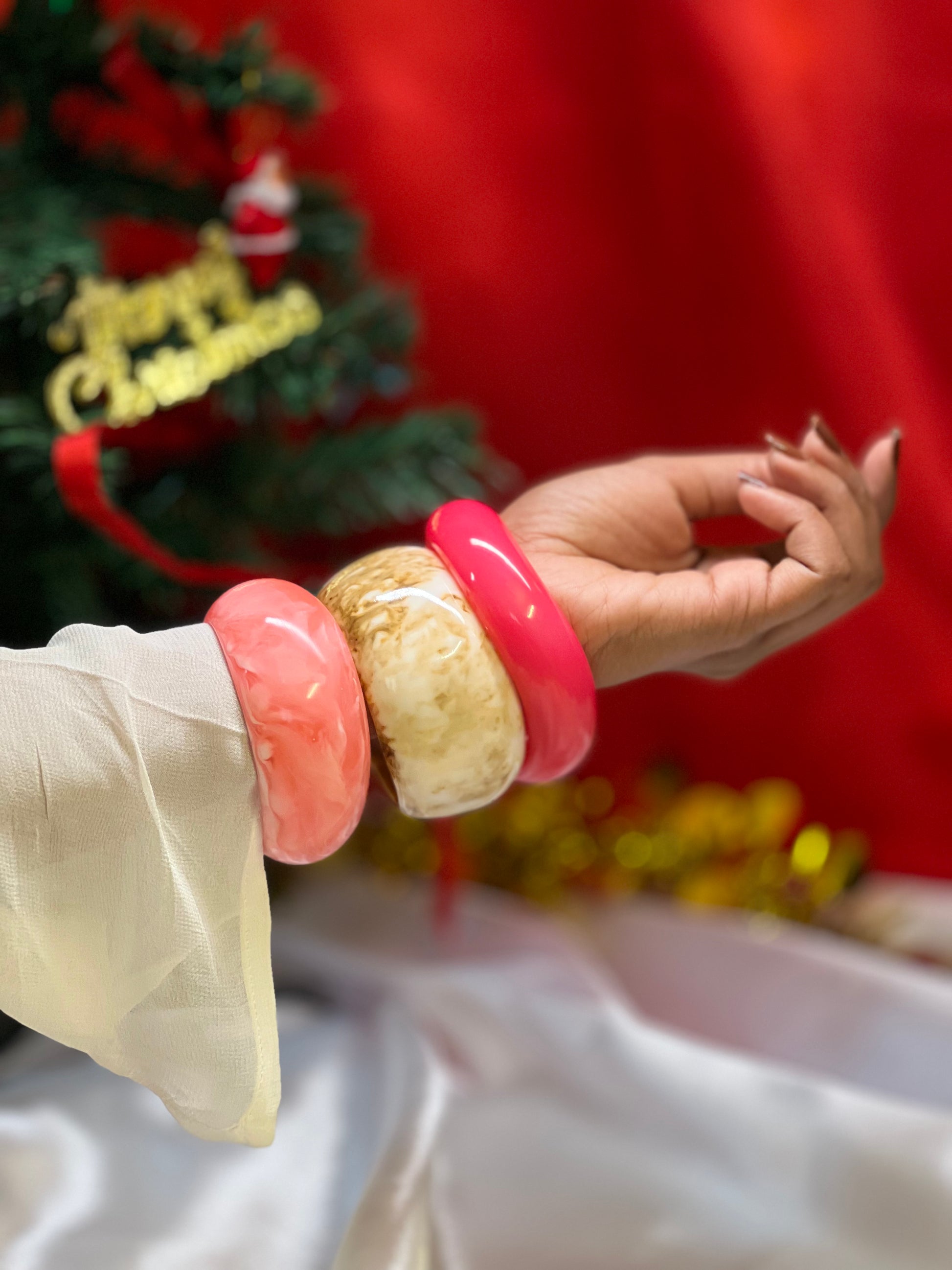 This set of three marble bangles features an unique shade. The set includes a vibrant pink bangle, a soft baby pink bangle, and a mild, cool toned marble bangle, creating a harmonious blend of playful and subtle hues. The marbled finish on each bangle gives a luxurious, artisanal feel, while the lightweight design ensures comfort for everyday wear. Perfect for layering, gifting, or elevating both casual and festive outfits, this trio brings charm, style, and versatility in one set.