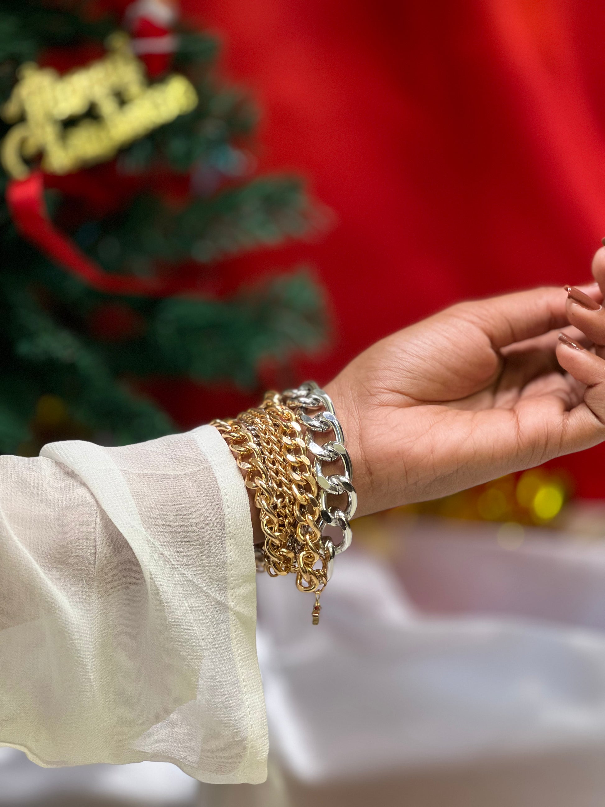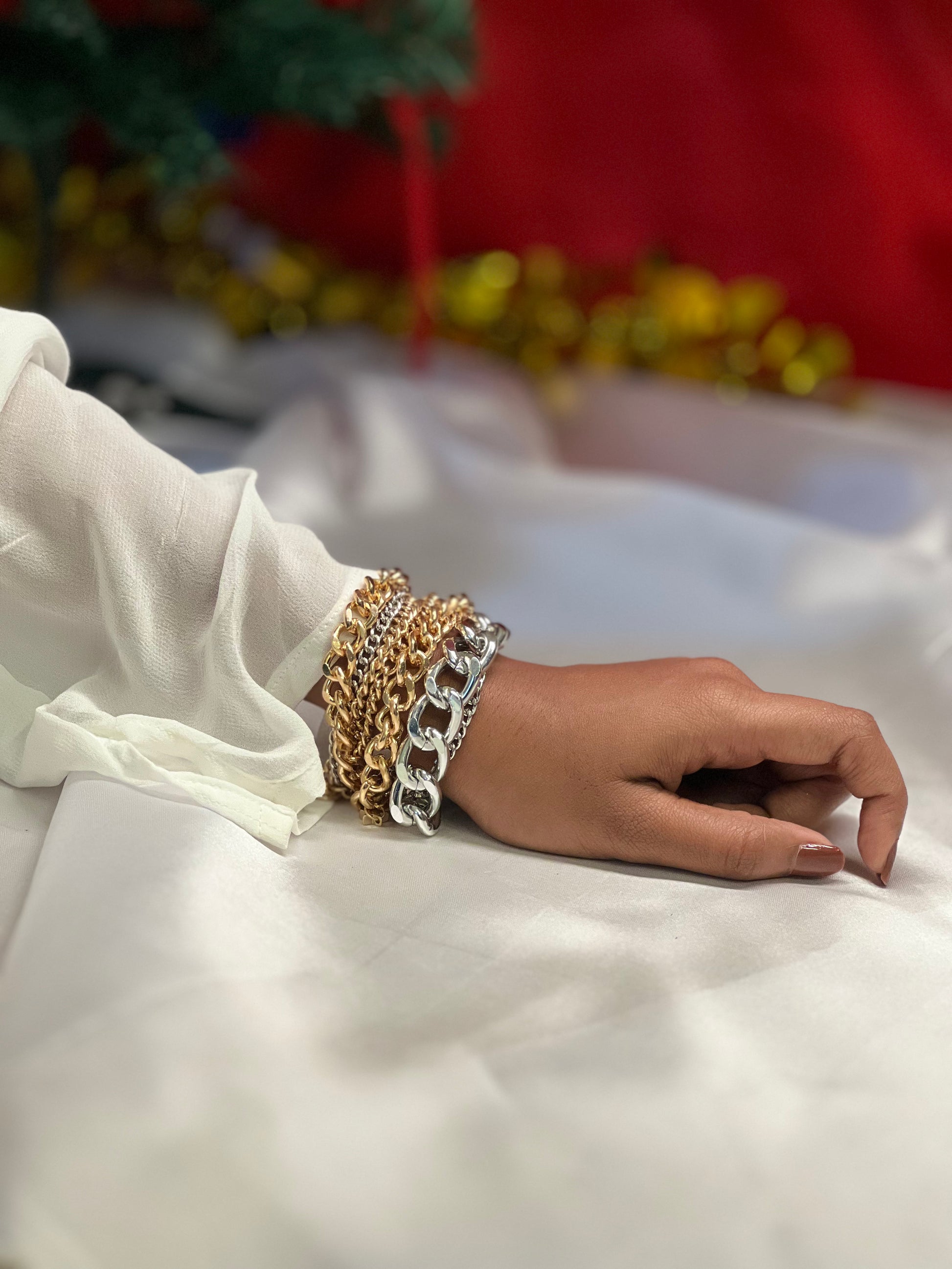 The Aurora Unity Bracelet Set is a bold and elegant fusion of tones and textures. Featuring multiple gold-colored bracelets gracefully tied together, this set is highlighted by a striking large silver bracelet at the center, creating a stunning contrast. Designed to make a statement, the combination of gold and silver adds depth and versatility, making it perfect for both contemporary and festive styling. Wear it as a single standout piece to elevate any outfit with effortless sophistication.