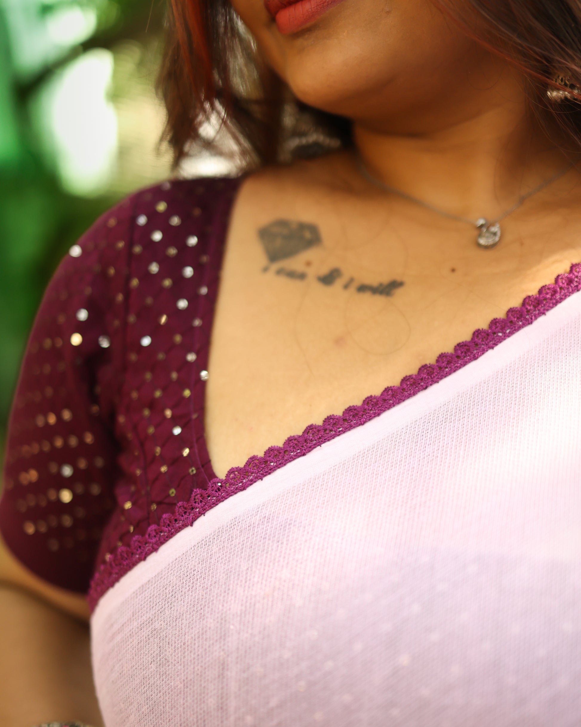 note** the blouse worn by the model is different from what our package contains, it has a purple self embroidered Blouse material.