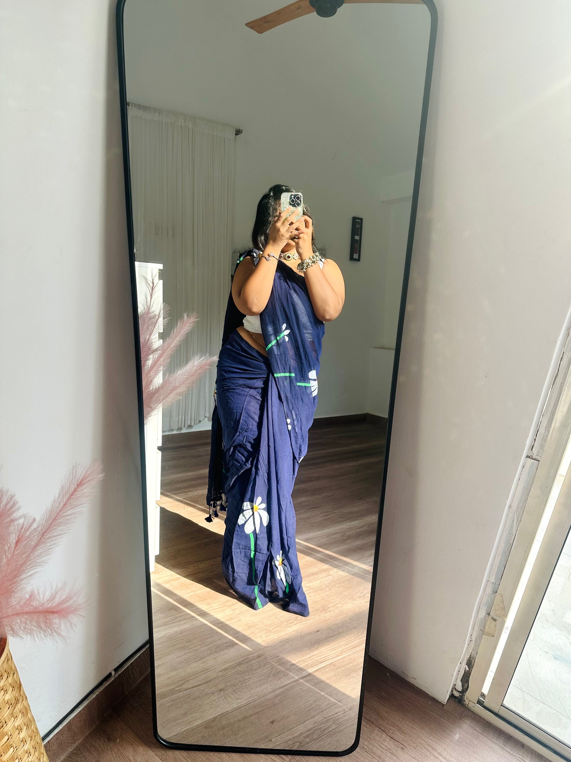 Mrunal sarees come in three beautiful shades – Dark Pink, Dark Blue, and Pure White, each covered with cute printed flowers that give a fresh and charming look.The fabric is very soft, lightweight, and breathable, making it perfect for all-day wear, especially in warm weather. It drapes nicely and feels gentle on the skin. Each saree comes with a white blouse piece.