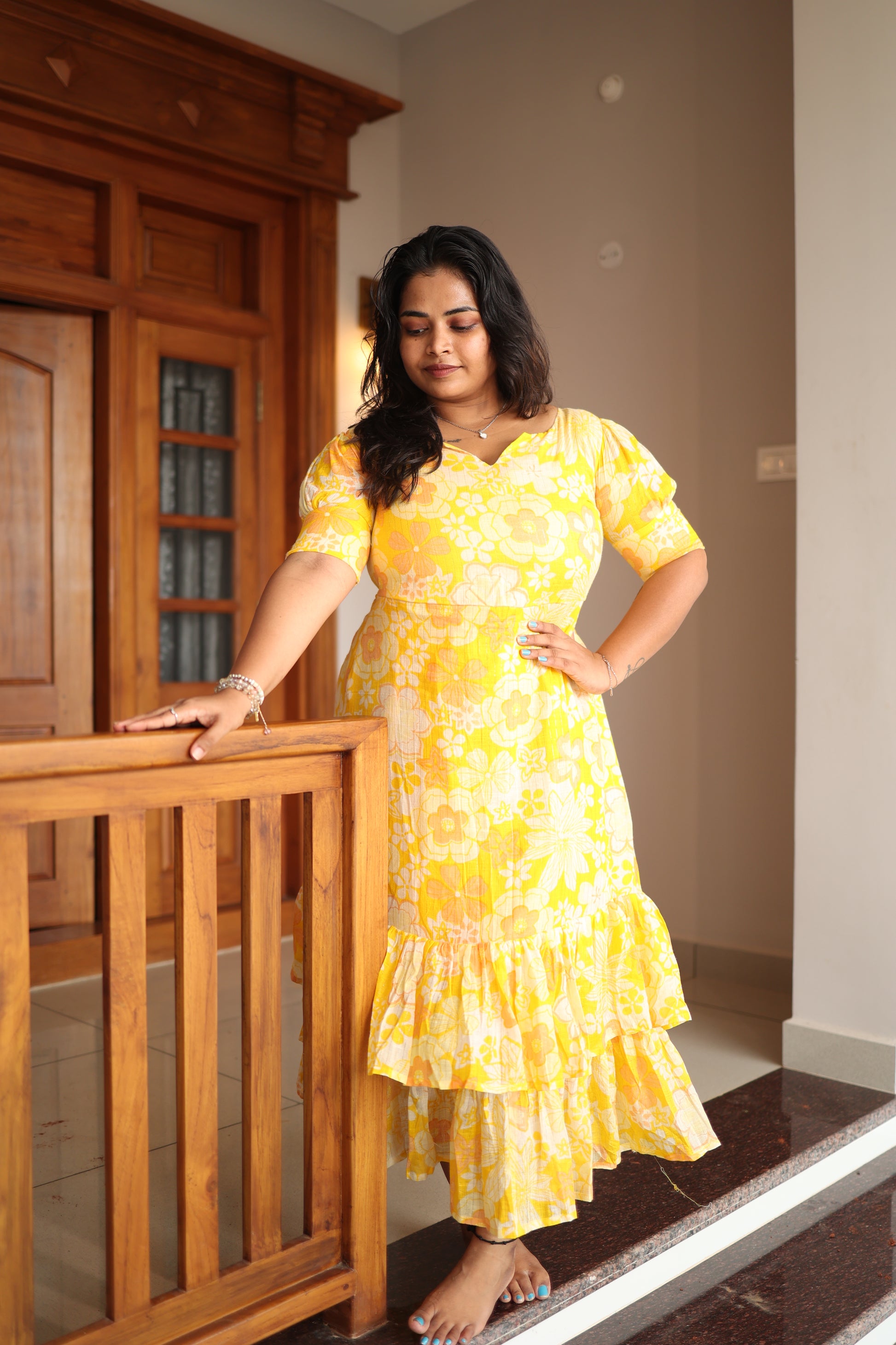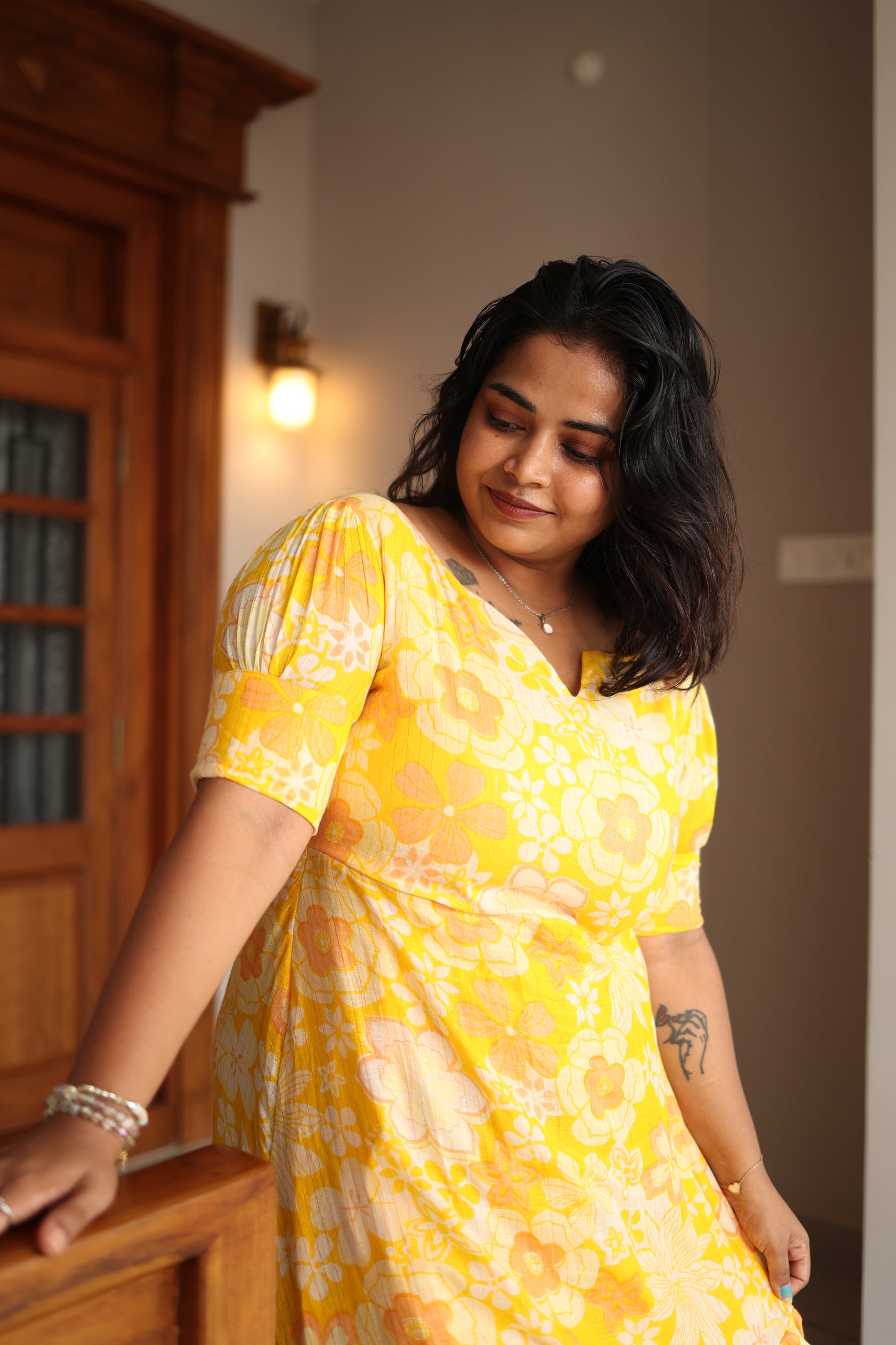 Sana is made from beautiful yellow mul cotton, featuring delicate floral prints. Crafted from soft, soothing fabric, this piece feels incredibly light on the skin perfect for all day wear and features elegant puff sleeves. Whether you're heading out for a casual brunch or a relaxed day out, its soothing fabric makes it a wardrobe favourite.