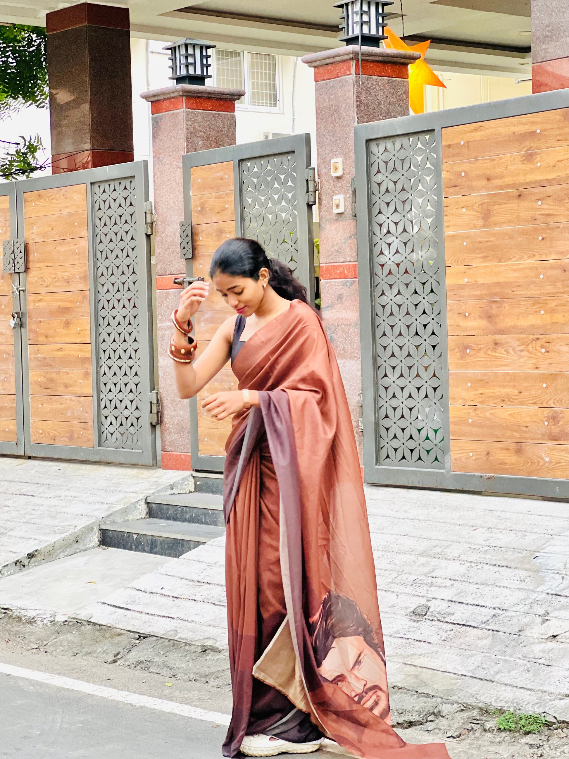 This tribute saree dedicated to Sivakarthikeyan is beautifully crafted in rich shades of brown, symbolising warmth and earthiness. The entire saree flows in a harmonious brown palette, giving it a classic and graceful appeal. This saree is made of mul mul. And the highlight of the saree is the pallu, where a detailed portrait of Sivakarthikeyan is artistically drawn, capturing his charisma and expressive presence. This unique hand rendered artwork transforms the saree into a wearable tribute, blending fashion with admiration and artistic devotion. The saree stands as a heartfelt homage, celebrating Sivakarthikeyan’s journey, charm.