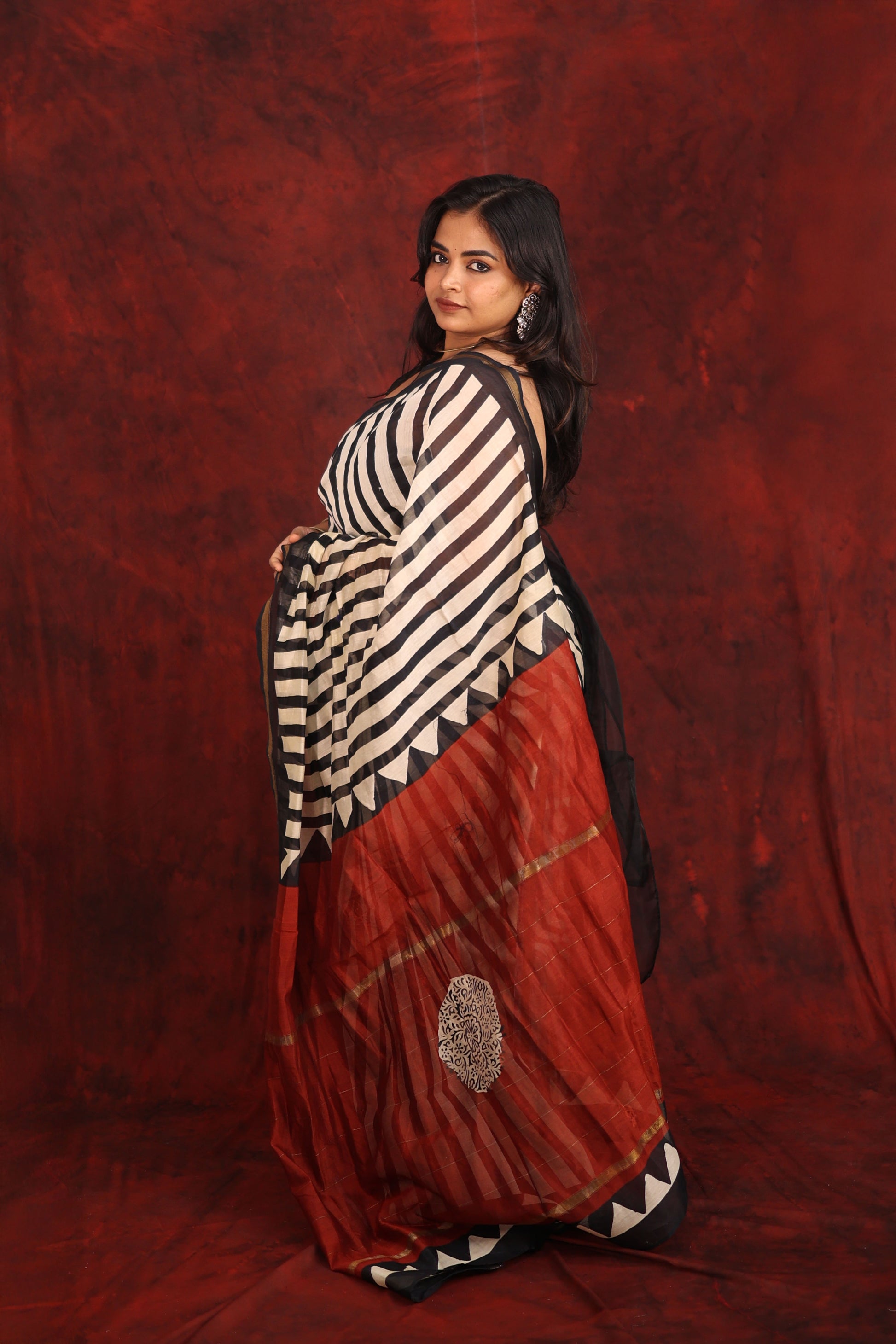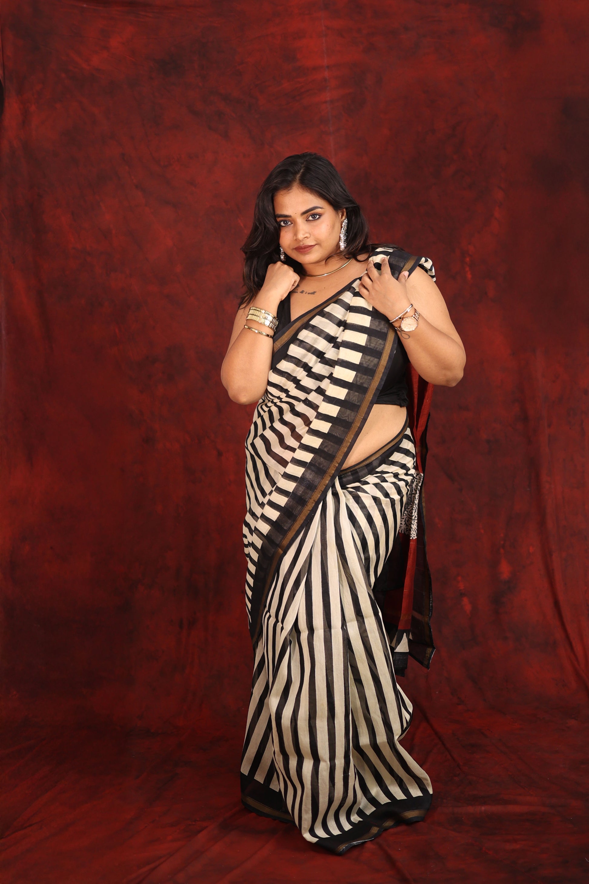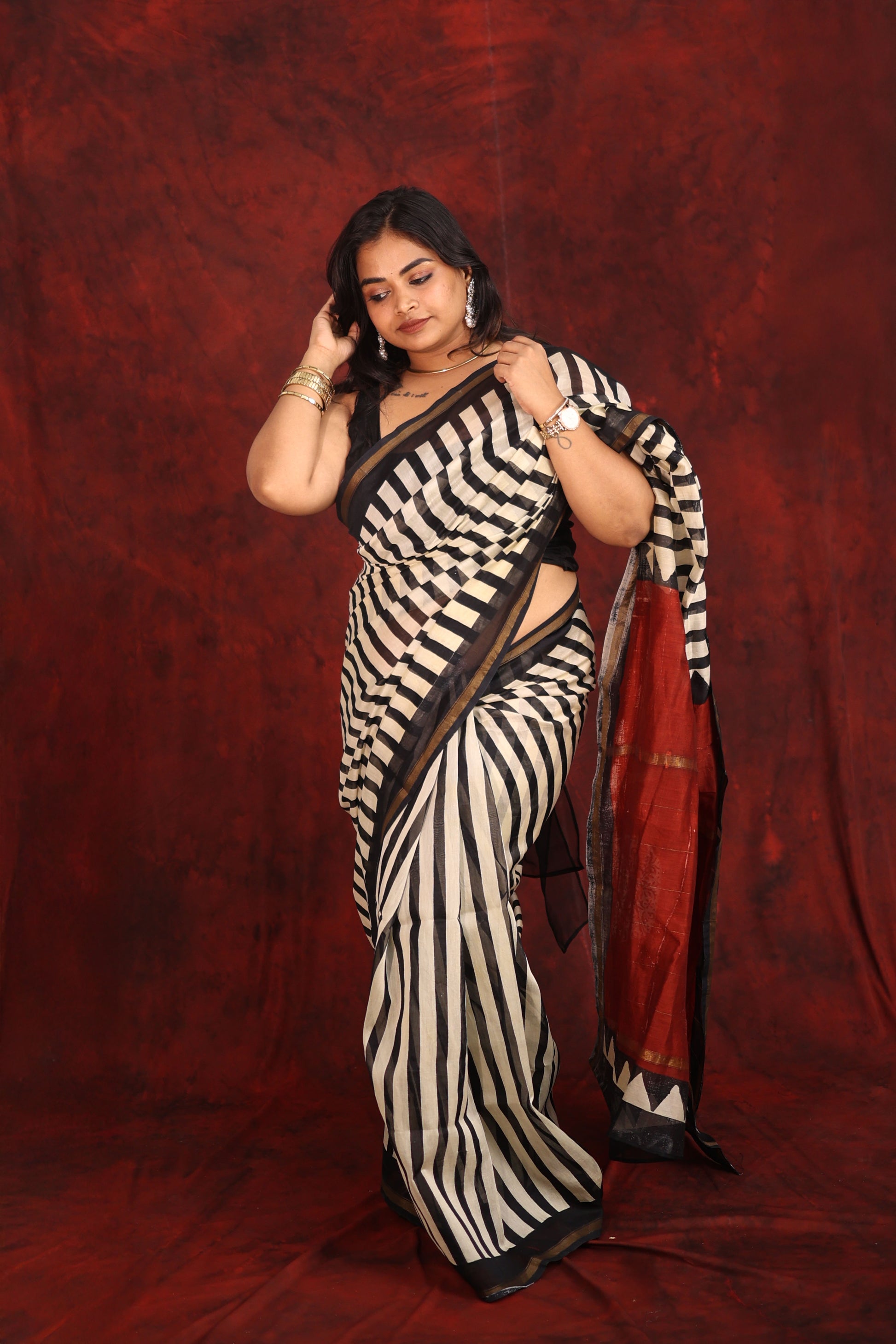 This striking striped saree features a bold blend of red, black, and white hues. The clean, contrasting stripes exude confidence and charm, making it a perfect choice for both formal and semi-formal occasions. Drape it with a plain black shirt or blouse for a powerful, boss lady look that effortlessly combines tradition with modern sophistication.